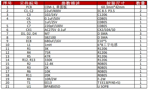 在电源管理设计领域,BPA8505D是一款备受推崇的芯片,它以其卓越的性能和灵活性,为工程师提供了一个全面的参考设计。本文将全面介绍BPA8505D的参考设计,包括简介、电路图、物料清单(BOM)、PCB布局图、电路实物图以及变压器规格书,为读者提供一个从设计到实现的完整视角。