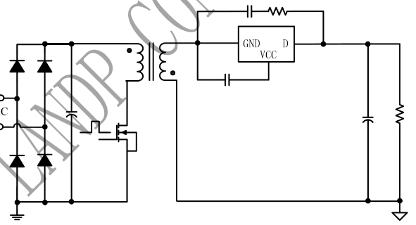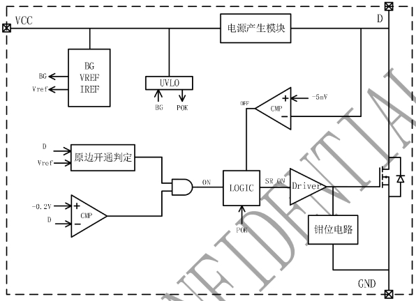 VCC供电:芯片内部集成了VCC供电技术,能够在不需要辅助绕组供电的情况下,保证VCC电压稳定.当系统上电后,通过内置MOS的体二极管对输出电容充电,当VCC电压达到开启阈值时,芯片内部控制电路开始工作。