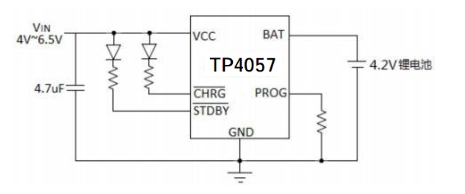 TP4057:输入电压范围较宽,为4.5V至6V。这意味着它能够适应更多种类的电源适配器,包括一些输出电压稍高的适配器,为设计提供了更大的灵活性。