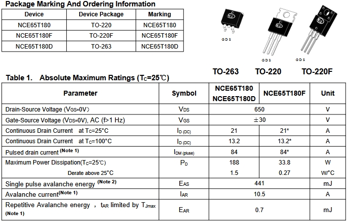 NCE65T180F新洁能TO-220F封装650V 21A N沟道MOS管场效应管