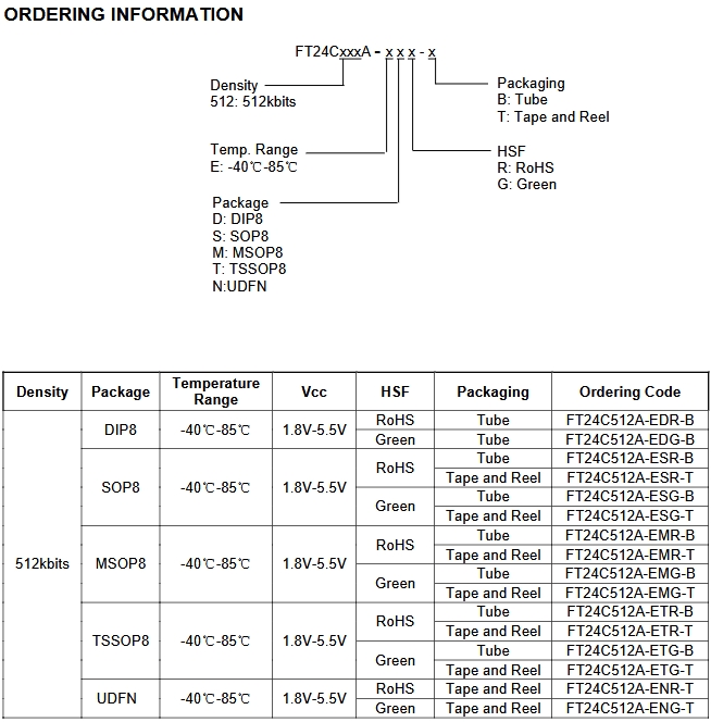 FT24C512A-ETR-T是一款512K位(65,536字节)的串行EEPROM芯片,采用标准的两线双向串行接口。它支持1.8V至5.5V的宽电压范围,适用于多种低电压和低功耗应用。该芯片具有128字节的页写模式,支持部分页写操作,确保数据写入的灵活性和高效性。