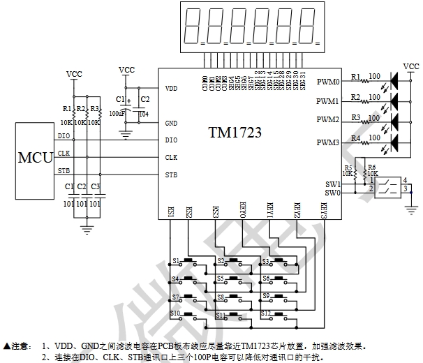 TM1723是一种带键盘扫描接口的LCD驱动控制专用电路,内部集成有MCU 数字接口、数据锁存器、LCD