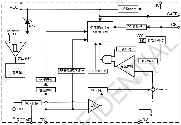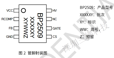?BP2509芯片定位?:一款高性能电流模式PWM控制器,支持宽输入电压(8V-450V),内置高压启动电路,适用于Buck、Buck-Boost等非隔离拓扑。内部框架图如下所示