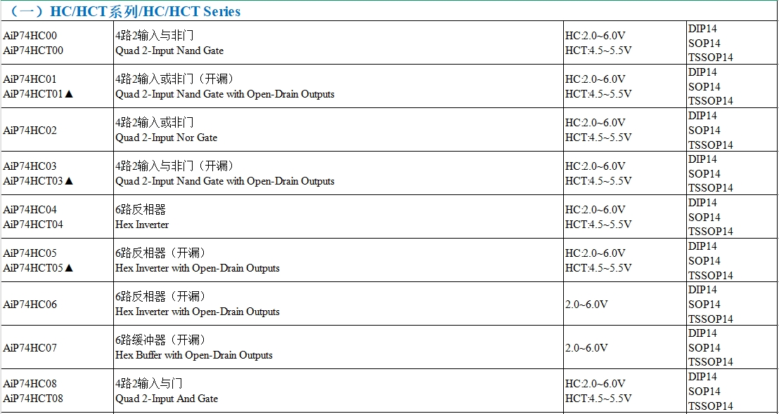 AC(先进CMOS)和ACT(先进CMOS TTL兼容)系列适用于高速应用。国产AiP74AC系列和AiP74ACT系列在高速性能上与进口产品相当。例如,AiP74AC00(4路2输入与非门)与TI的SN74AC00在工作电压(1.5~5.5V)、传播延迟(3ns)和封装形式(DIP14, SOP14, TSSOP14)上完全兼容。