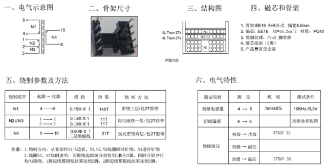 变压器作为电源适配器中的关键部件,其性能直接影响电源转换效率与输出稳定性。该适配器采用 EE16 型号的变压器,初级与次级绕组匝数比为 140:21,电感量设定为 2mH,磁芯有效截面积为 19.2mm2。