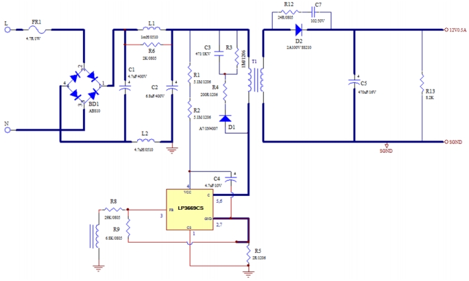 在现代电子设备中,电源适配器作为核心的供电组件,其性能的优劣直接关系到设备的稳定运行与使用寿命。本文将对一款基于 LP3669CS 控制芯片与 SS210 二极管设计的 12V0.5A 电源适配器进行深入分析,涵盖其原理图解析、电路板实物展示以及关键变压器资料解读,全方位呈现该适配器的设计理念与实际性能表现。