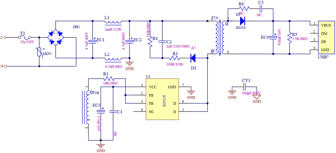 S7142S的参考设计采用了先进的电路架构,确保了电源的高效转换和稳定输出。芯片内部集成了多种保护功能,如过压?;ぁ⑶费贡;?、过流保护等,这些功能不仅提高了电源的安全性,还延长了设备的使用寿命。此外,S7142S还具备低待机功耗的特性,其空载待机功耗小于100mW,这使得它在节能方面表现出色,符合现代电子设备对环保和能效的要求。