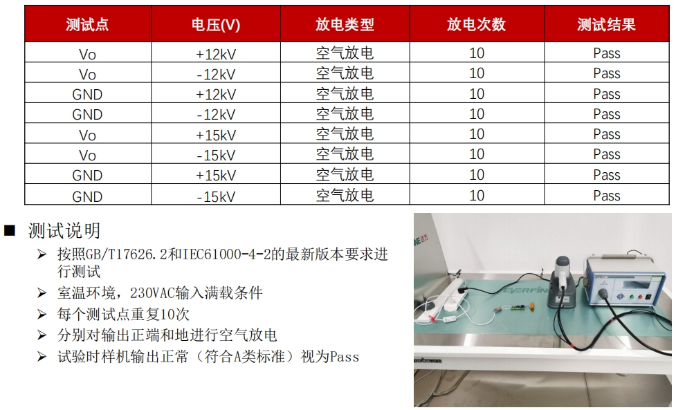 ESD(静电放电)测试是评估电源芯片抗静电干扰能力的关键测试。S7142S在ESD测试中表现出色,其输出端和地端在±12kV和±15kV的空气放电条件下均能正常工作,符合A类标准。这表明S7142S在抗静电干扰方面具有卓越的性能,能够有效?;ど璞该馐芫驳缢鸹?。