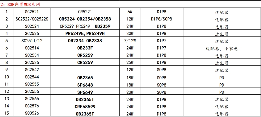 SSR内置MOS系列是鼎芯微电子推出的另一类高效电源管理芯片,适用于适配器、小家电等应用场景。以下是该系列部分型号及其替代型号: