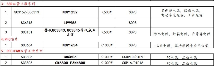 SSR双管正激系列是鼎芯微电子推出的一类高性能电源管理芯片,适用于高功率应用场景,如显示屏电源、防雨电源、电动车充电器、工业电源等。以下是该系列部分型号及其替代型号: