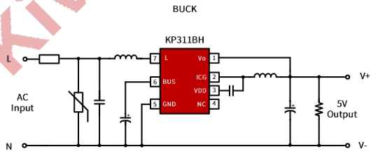 输入电源:输入电源通过变压器的初级绕组连接到 KP311BHWG 的输入端,为芯片提供工作电压。