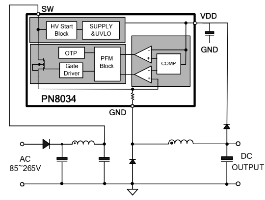 PN8034内置高压启动模块,能够实现系统快速启动和超低待机功耗,待机功耗低于100mW。