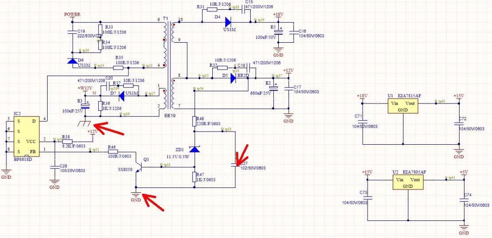 电路板实物图是电路设计的直观呈现。从实物图中可以看到,该电源方案的电路板布局紧凑合理,元件排列整齐,布线清晰。主控芯片 BPA8618D 安装在电路板的正面,周围分布着与其相关的电阻、电容等元件,便于信号传输和调试。变压器 T1 位于电路板的中心位置,占据了较大的空间,其多绕组结构通过不同的引脚与电路连接,实现了高效的能量转换。输出端的接口设计在电路板的边缘,便于与外部设备连接。整个电路板采用了双面板设计,通过合理的布线和元件布局,有效减少了电磁干扰,提高了电路的稳定性和可靠性。