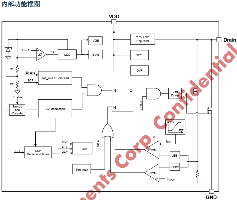 当输入高压直流电时,KP328X内部的高压启动电路开始工作,从Drain端取电并通过高压电流源对VDD电容进行充电。当VDD电压上升至VDD_ON时,芯片开始工作。
