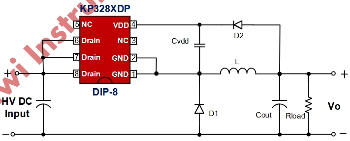 在该电路中,HV DC Input为高压直流输入端,Vo为输出电压端,Drain为内部高压MOSFET的漏极,GND为参考地。Cvdd为VDD脚的滤波电容,推荐采用1uF陶瓷电容;L为电感,用于储能和滤波;D1和D2为二极管,用于整流和续流;Cout为输出滤波电容,用于平滑输出电压;Rload为负载电阻,代表实际应用中的负载设备。