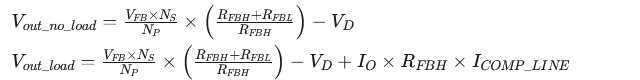 其中,RFBH 是 FB 外接的上偏电阻,RFBL 是 FB 外接的下偏电阻,ICOMP_LINE 是满载经过 FB 上偏电阻的输出线补偿电流,Nf 是辅助绕组匝数,VFB 是基准电压(典型值 1.0V),VD 为输出续流管压降,IO 为带载电流,IOCP 为输出恒流电流。