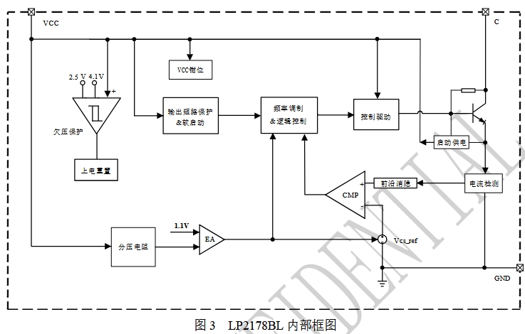 LP2178BL的启动过程非常简洁。芯片仅需1uA的启动电流,系统上电后,通过内部启动供电电路对VCC的电容进行充电。当VCC电压达到芯片开启阈值时,内部控制电路开始工作,输出电压开始上升并建立。在输出电压稳定后,VCC由输出电压供电,确保系统的持续运行。