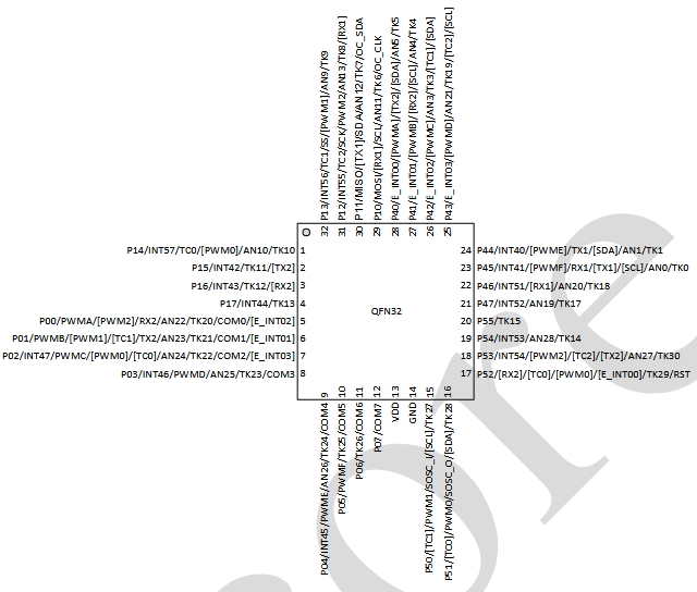 AiP8F3532 提供了多种封装形式,包括 SOP32、SOP28、LQFP32 和 QFN32 等,以满足不同用户的需求。以下是其中几种封装形式的引脚排列图: