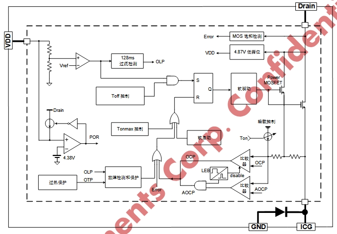 | I_Drain_leakage | 高压漏电电流 | Drain=500V, VDD=6V | - | - | 80 | μA |