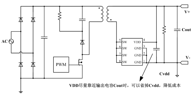 PL3331 的典型应用电路图展示了其在反激式开关电源中的简洁而高效的连接方式。在图中,输入电压(V+)通过变压器连接到 PL3331 的 SW 管脚,而输出电压则通过电容(Cout)进行滤波。为了确保系统的稳定运行,PL3331 的 VDD 管脚需要连接到一个稳定的电源,通常是从输出电压中获取。此外,为了降低成本,当 Cvdd 尽量靠近输出电容 Cout 时,可以省略 Cvdd。