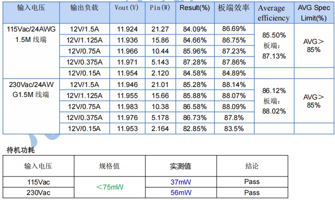 在不同输入电压(90Vac、230Vac、264Vac)和负载条件下,对电源的输出电压精度、效率、纹波等关键参数进行了测试。测试结果显示,电源在各种条件下均能满足设计要求,输出电压精度高,效率稳定,纹波控制良好。