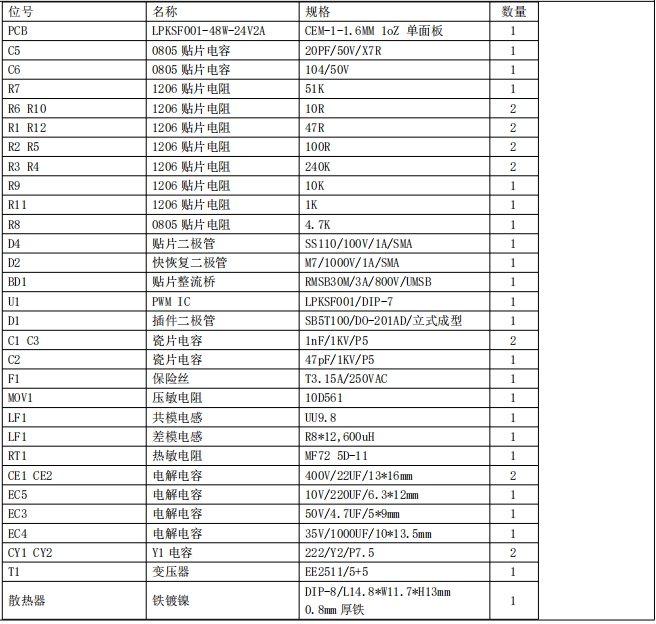 BOM(物料清单)是DEMO样板的重要组成部分,它详细列出了所有用于构建电源的元件。LPKSF001的BOM清单包括: