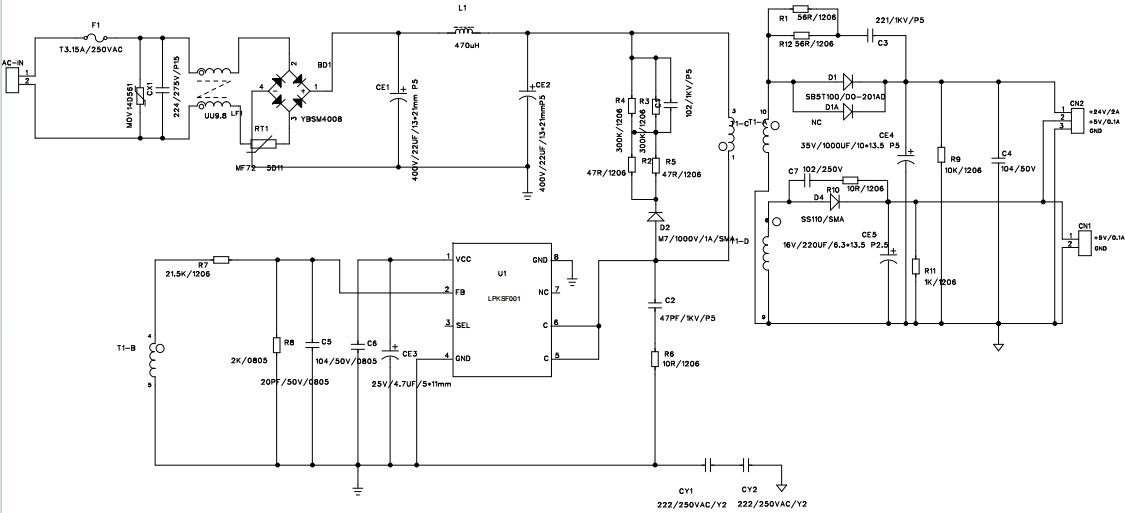 LPKSF001的原理图是理解其工作原理的关键。它采用反激式拓扑结构,通过外置电阻和变压器匝比来精确控制输出电流和电压。原理图中还包括了输入滤波电路、整流电路、反馈电路以及?;さ缏返裙丶糠?。通过内置的启动电路和自供电技术,LPKSF001无需外部启动电阻和辅助绕组VCC供电二极管,从而进一步简化了外围设计。