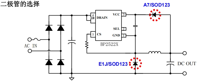 以BP2522D为例,持续输出240mA,脉冲350mA,电感量为470uH,电感电流纹波为57mA。最大峰值电流为579mA,BP2522D内部MOS管限制最大电流为750mA,留有一定余量,可取Rcs=0.3ohm。