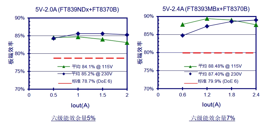 FT8370X系列芯片在不同负载条件下均能保持高效率。例如,FT8370B在2.0A - 2.4A输出范围内,效率可达90% @ 115V和90% @ 230V。FT8370CP在2.5A - 3.4A输出范围内,效率可达88.48% @ 115V和87.40% @ 230V。