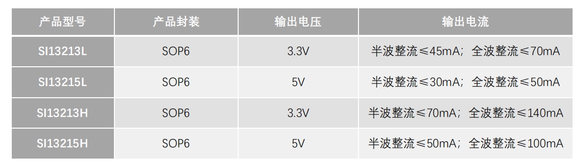 输出电流:SI13213L在半波整流条件下的最大输出电流为45mA(L版本)和70mA(H版本),全波整流条件下分别为70mA和140mA。SI13215L在半波整流条件下的最大输出电流为30mA(L版本)和50mA(H版本),全波整流条件下分别为50mA和100mA。可见,SI13213L/H的输出电流能力略高于SI13215L/H。