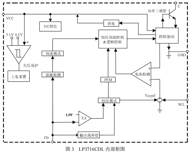 该框图展示了芯片的主要功能??椋üβ嗜?、VCC供电电路、恒压恒流控制电路、保护功能电路等。通过这些模块的协同工作,LP3716CDL能够实现高效的电源管理和精确的输出控制。
