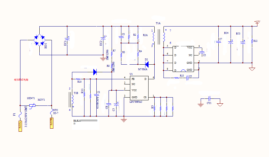 下图展示了一个典型的12V3A电源PSR方案,使用LP3799FAC芯片作为核心组件。