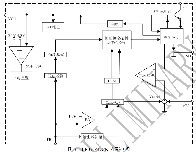 其中,SEL管脚的功能尤为关键,它通过与GND或VCC的不同连接方式,决定了芯片的内置峰值电流阈值。当SEL接GND时,内置峰值电流阈值为620mA;而当SEL接VCC时,内置峰值电流阈值则为760mA。这种灵活的电流阈值设置方式,使得LP3716NCK能够适应不同功率需求的应用场景。