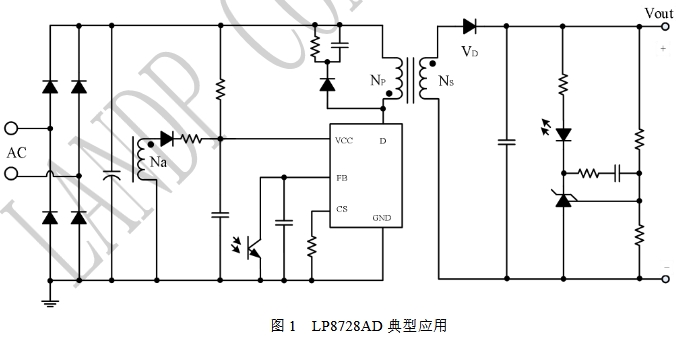 LP8728AD的典型应用电路如下图所示。在该电路中,AC输入电压通过变压器的原边绕组连接到D引脚,CS引脚用于检测开关电流,FB引脚通过光耦接收副边反馈信号,VCC引脚为芯片提供电源。