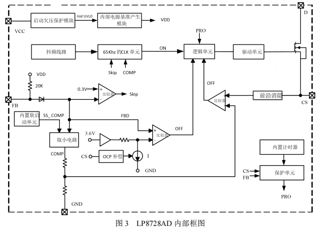 此外,LP8728AD还具备特有的OCP补偿技术,能够实现不随输入电压变化的恒定输出功率。通过频率抖动技术,该芯片还能有效改善EMI指标,降低电磁干扰。