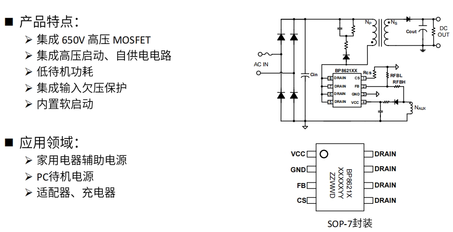 BP86216P 是由晶丰明源(BrightPower Semiconductor)推出的一款高性能电源管理芯片,专为中小功率电源适配器设计。它集成了 650V MOSFET,并采用先进的控制技术,能够实现高效率、低待机功耗和优异的动态响应。