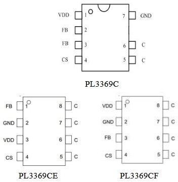 | 引脚功能 | PL3369C (SOP-7) | PL3369CE (SOP-8) | PL3369CF (SOP-8) |