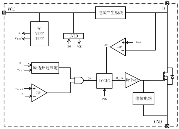 LP3588BS是由芯茂微推出的一款高性能开关电源同步整流芯片,专为充电器和适配器的同步整流应用而设计。它支持DCM(不连续导通模式)和CCM(连续导通模式)多种工作模式,能够有效提升电源转换效率,降低功耗。该芯片采用SOP8L封装,具有紧凑的尺寸和良好的散热性能,非常适合高功率密度的应用场景。内部框架图如下所示