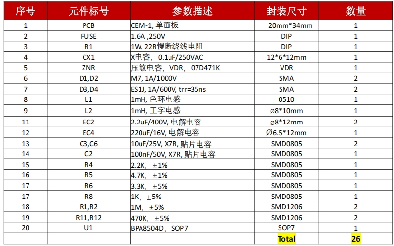 BPA8504D 芯片:SOP-7 封装,集成 650V MOSFET 和 PWM 控制器。