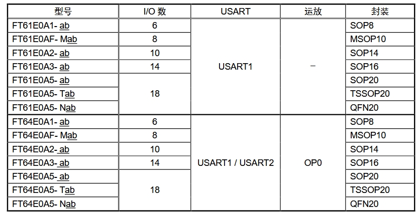 注:FT61E0A为同系列简化版(无USART2和运放),型号仅差一位“1”。