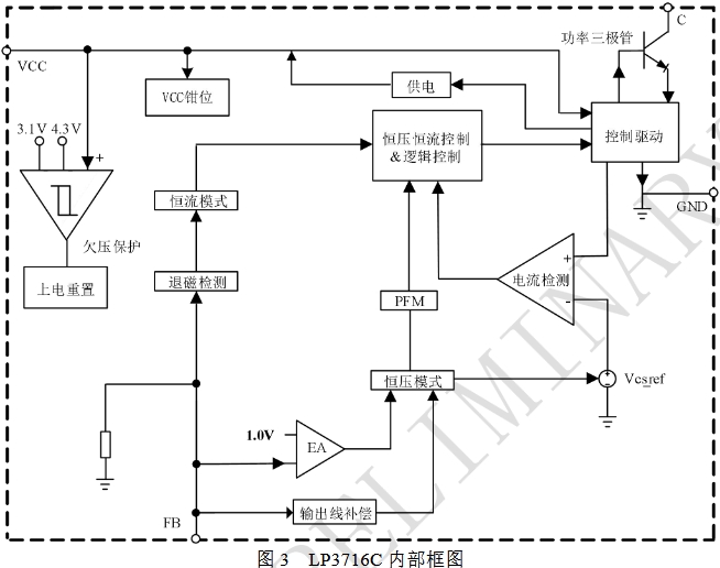 LP3716RD:DIP7的金属引脚直接形成散热通道,同功率下温度降低18℃,为28W应用预留余量。LP3716RD内部框架图如下所示~