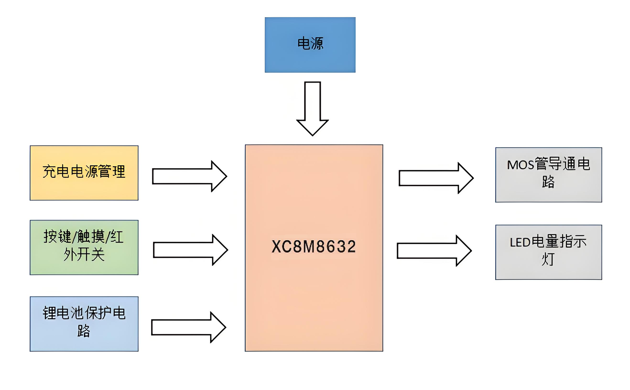 在本方案中,主控电弧打火机芯片采用矽杰微单片机XC8M8632,支持定制开发(比如:触摸开关、红外开关、电量显示等),该点烟器芯片主要负责功能如下: