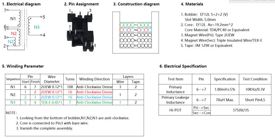 漏感:短接N3,6-7脚读<70 μH;