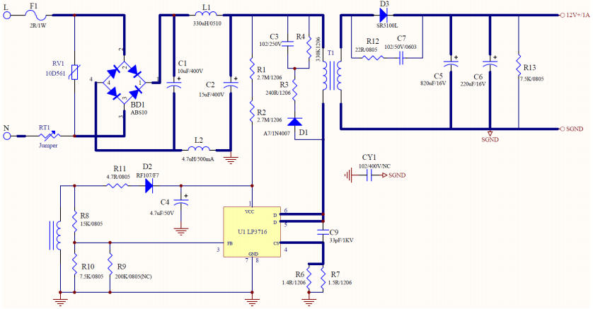 官方参考设计 LP3716+SB5100L 实测 83.3% 效率、<75mW 待机、12V±0.5% 精度,堪称小功率适配器“极简派”代表作。
