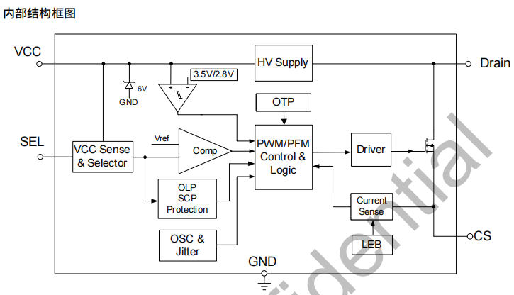 芯片上电后,内部500 V高压恒流源先把VCC冲到3.5 V,启动完成后高压源关断,由输出电压经电感耦合给VCC续电,实现“零辅助绕组”反激式供电;同时采样VCC跌落,一旦低于3.0 V(3.3 V版本)并持续160 ms,判定输出过载,进入4 kHz打嗝模式,1.6 s自动重启。峰值电流比较器仅200 mV阈值,配合250 ns前沿消隐,既能精确限流又不怕DRAIN尖峰误触发。温度检测位于MOS栅极区,热阻155 °C/W,确保芯片在塑料外壳密闭环境下也能安全降额。