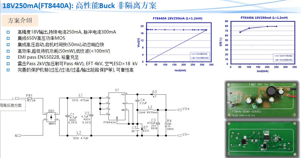 | 非隔离 Buck | 18V/250mA | 86%@230V | 1.2mH 电感 | 32×20mm | FT8440A |