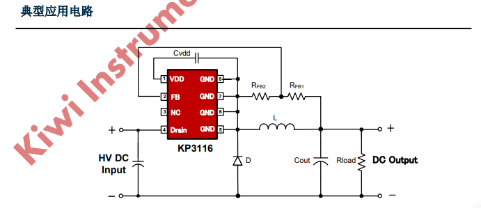 KP3116 是一款高性能低成本 PWM 控制功率开关,适用于离线式小功率降压型应用场合,外围电路简单、器件个数少。同时产品内置高耐压 MOSFET 可提高系统浪涌耐受能力。
