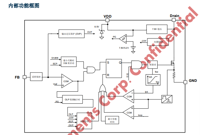 KP3114 集成有完备的带自恢复功能的?;すδ埽?VDD 欠压?;?、逐周期电流限制、输出过压?;ぁ⒐缺;ぁ⒐乇;ず?VDD 过压保护等。