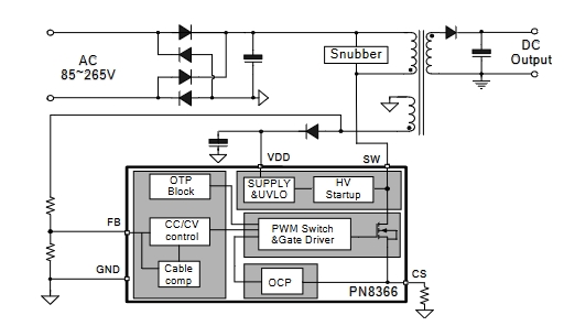 PN8366SSC-R1M集成超低待机功耗准谐振原边控制器及高雪崩能力智能功率MOSFET(PN8366M 700V,PN8366H 800V),用于高性能、外围元器件精简的充电器、适配器和内置电源。