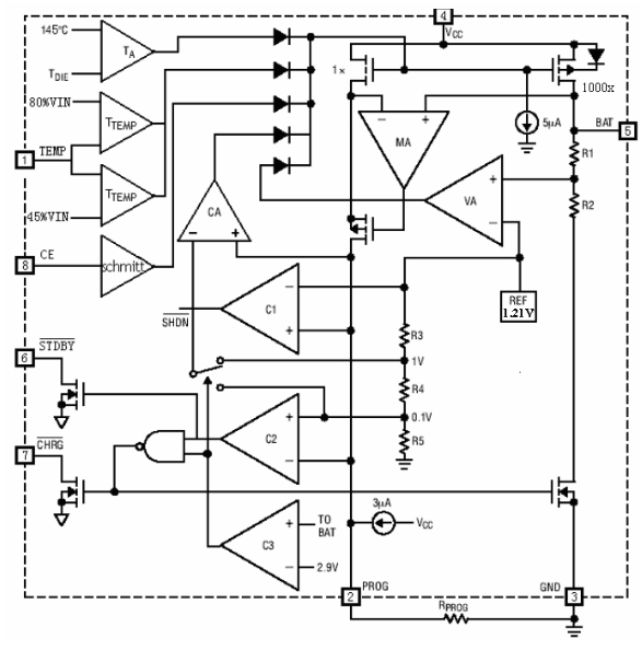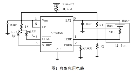 充电电压被固定在4.2V,充电电流可通过外部电阻设置。当充电电流在达到最终浮充电压之后降至设定值 1/10 时,AP5056 将自动终止充电循环。当输入端(适配器或USB电源)拔掉后,AP5056自动进入低电流状态,电池漏电流将降到2μA以下。AP5056还可被设置于?;刺?,使电源电流降到50μA。其余特性包括:电池温度监测,欠压锁闭,自动再充电和两个状态引脚以显示充电和充电终止。